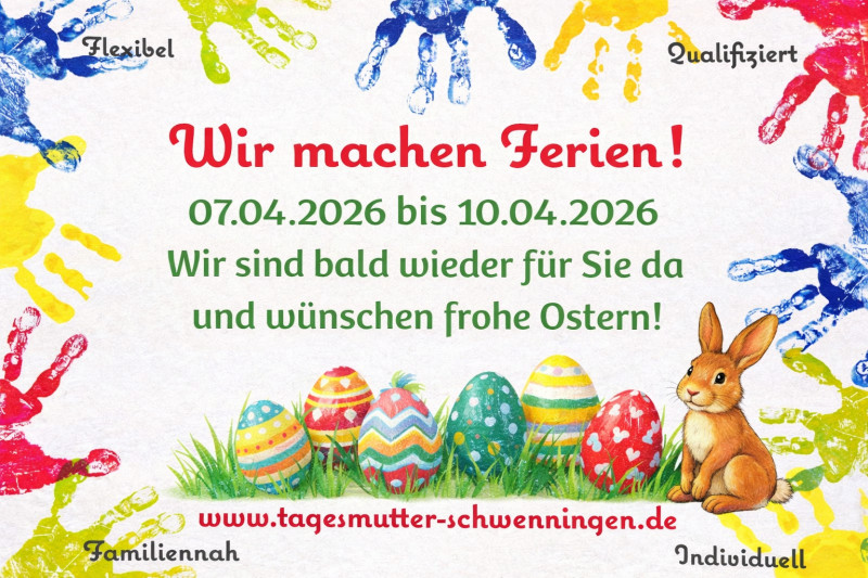 Die Betreuung Ihres Kindes erfolgt in großzügigen Räumen in Schwenningen mit kindgerechter Ausstattung. Die Öffnungszeiten meiner Kindertagespflege sind: